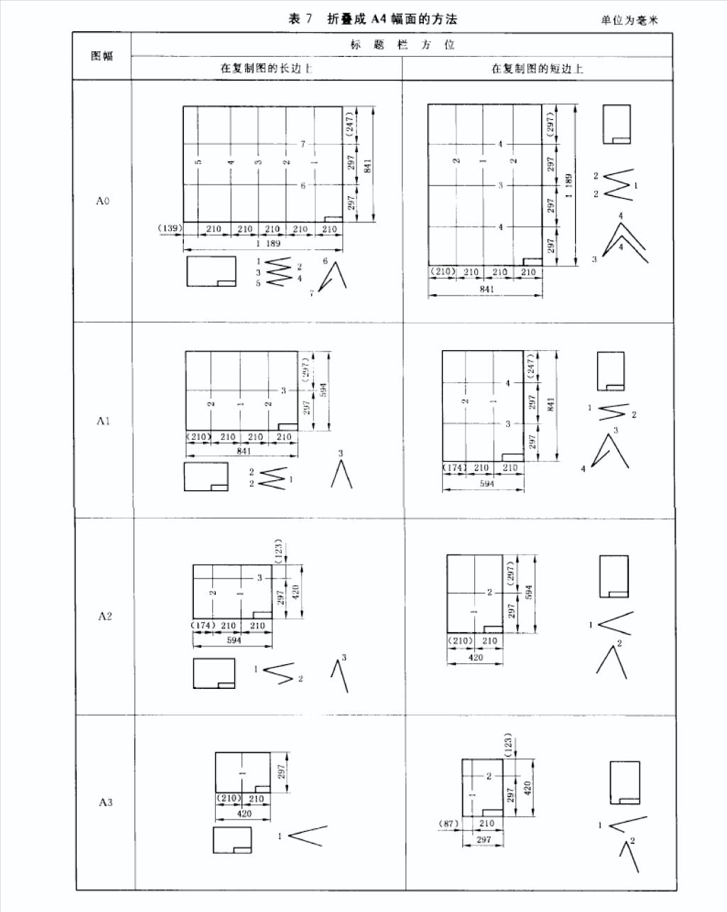 首先沿标题栏的长边方向折叠,然后再沿标题栏的短边方向折叠成A4或A3的规格,使标题栏露在外面,如表5和表6所示。