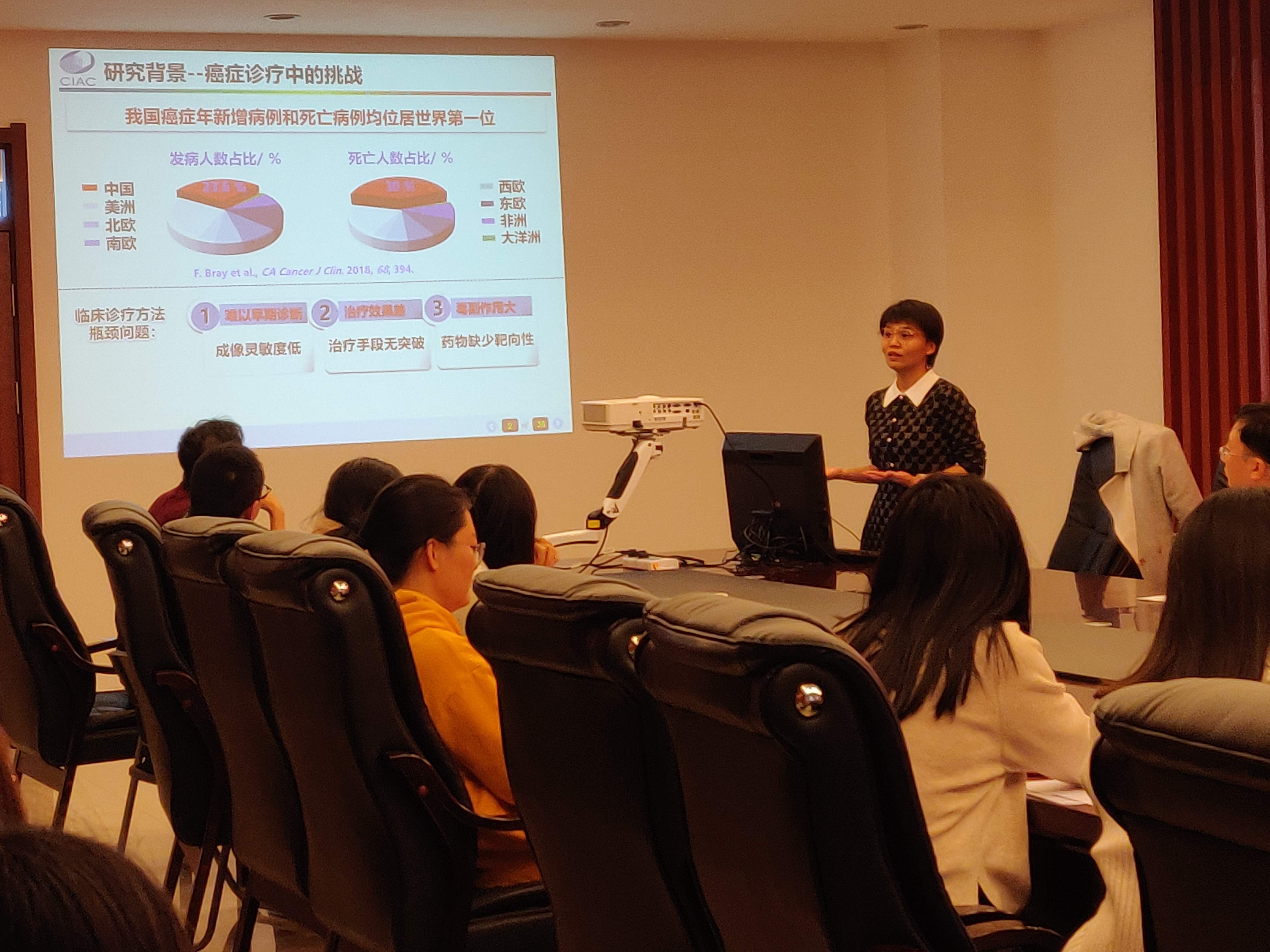 报告会上,王樱蕙老师从在化学学院学习时的经历谈起,简要介绍了自己的近几年的求学和工作履历以及目前所在的研究团队和研究方向。王樱蕙老师的研究内容主要是围绕现代癌症的诊疗技术展开,解决目前癌症临床诊断方法遇到的瓶颈问题。在报告中,王樱蕙老师向大家介绍了新型纳米诊疗材料在现有的癌症早期诊断、转移检测及治疗水平提升等方面的最新进展,并列举了其研究小组最近几年在相关领域的研究成果。王樱蕙课题组通过结构设计将光增强的CDT、PDT、PTT和MRI成像功能与肿瘤微环境(TME)特异性信号相应因子在纳米粒子中集成制备新型纳米诊疗剂,实现肿瘤的精准定位、靶向识别和特异性高效治疗。该研究在癌症治疗中具有巨大的潜力,也为肿瘤协同治疗提供了新的思路。王樱蕙老师在新型纳米诊疗剂方面取得的丰硕科研成果以及对前沿科学的敏锐洞察力,给与会师生留下了非常深刻的印象。会后,针对各位老师和同学在新型纳米诊疗剂方面的研究问题,王樱蕙老师进行了热情细致的解答,现场气氛十分热烈。