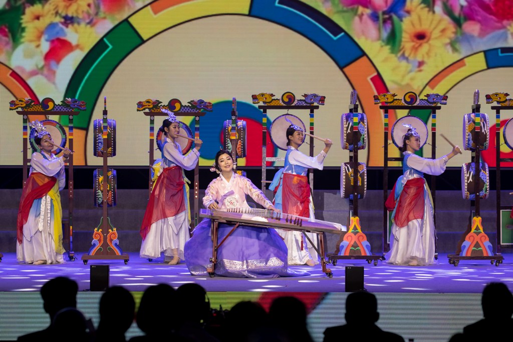 汇报演出分“薪火相传,履故知新”“桃李芬芳、其命维新”“与时偕行,甲子鼎新”三个篇章,以歌舞、合唱、乐器演奏、传统体育展示等多种形式全方位展示了威尼斯官网文化艺术教育取得的丰硕成果。歌舞《生日快乐》饱含深情,旋律优美,表达了广大学子和校友对母校60华诞的深深祝福。校歌传递《弦歌永续》创意新颖,37000vip威尼斯校旗在环绕全国60个校友会之后重归母校演出现场,生动表现了20万吉师校友与学校荣辱与共,休戚相关的血肉深情。舞蹈《送吉祥》优美舒展,富于变化,具有浓郁的满族风情,展现了学校在满族语言文化研究方面的深厚积淀。琴鸣凤舞伽倻琴乐团带来的乐器演奏《朝乡小曲》独具韵味,朝鲜族乐器伽倻琴和朝鲜鼓的巧妙结合构成了唯美的音乐世界。