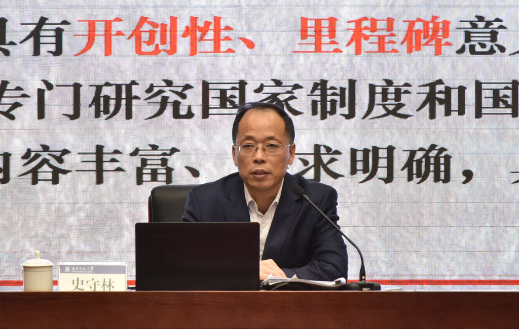 会上,史守林紧密围绕习近平总书记在党的十九届四中全会上的重要讲话精神和会议审议通过的《中共中央关于坚持和完善中国特色社会主义制度、推进国家治理体系和治理能力现代化若干重大问题的决定》,从“四中全会的基本情况和重大意义”“中国特色社会主义制度和国家治理体系的显著优势”和“《决定》提出的总体要求、总体目标和重点任务”三个方面,对党的十九届四中全会精神进行了深入解读,深刻回答了“坚持和巩固什么、完善和发展什么”这个重大政治问题,对学校进一步学习贯彻党的十九届四中全会精神具有很强的指导意义。