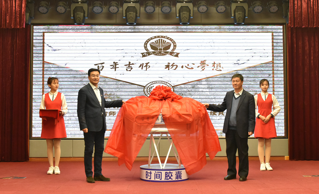 杨景海在仪式上讲话。他指出,吉师六十余载,力行大道、革故鼎新。办学规模实现历史跨越、教育质量全面提高、科研实力稳步提升、人才培养硕果累累、国际交流开放融通。今天的吉师,气象蓬勃、文脉绵长,正朝着特色鲜明、多学科协调发展的高水平师范大学宏伟目标阔步前进。今天的吉师人站在过去和未来之间,秉承着过去的期许,怀揣着未来的期盼。通过“时间胶囊”的形式,把几代吉师人传承的期许与期盼缔结为接力百年的信笺,埋藏在这里、封存在这里,留给未来去见证。他强调,百年吉师的未来可期可待。“六个吉师”的美好蓝图、“博士授权”的美好愿景,正展开有力的臂膀拥抱着未来!百年吉师、初心梦想,正引领吉师奔向特色高水平师范大学的梦想之巅!
